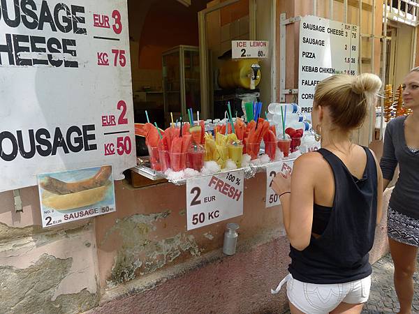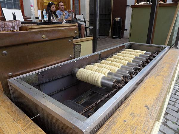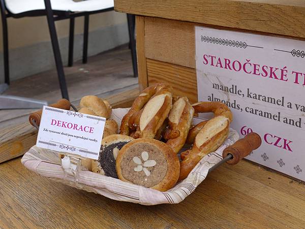 從橋下往上走去,途中不時可見這種捷克當地的傳統小舖--烤麵包捲,把麵皮桿成一捲捲的,烤過之後再灑上糖粉,看起來就很美味喔~~