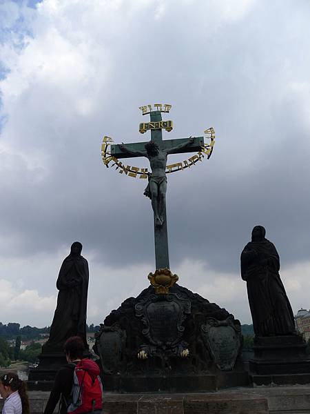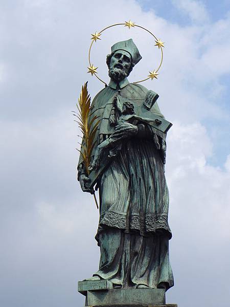 接著,我們逛到橋上最重要的一尊--聖約翰內波穆克雕像,據說內波穆克因為違逆了當時的皇帝瓦次拉夫,因而被賜死丟入伏爾塔瓦河,當天晚上,沈沒的地方浮起了5顆星星,所以這尊雕像的頭上也有5顆星星的光環