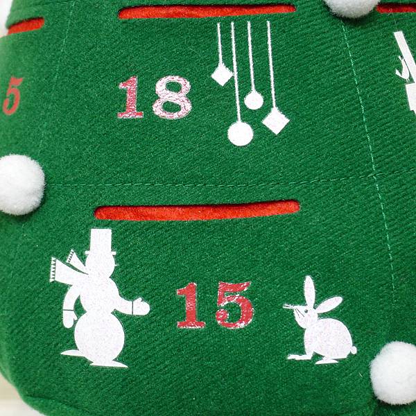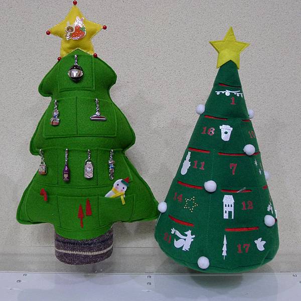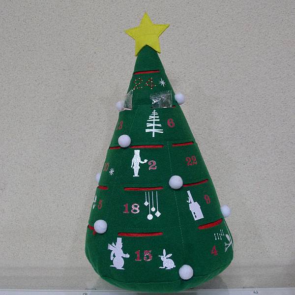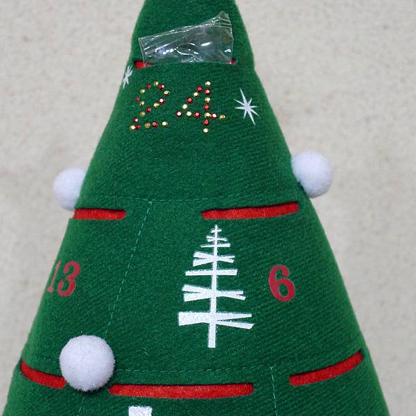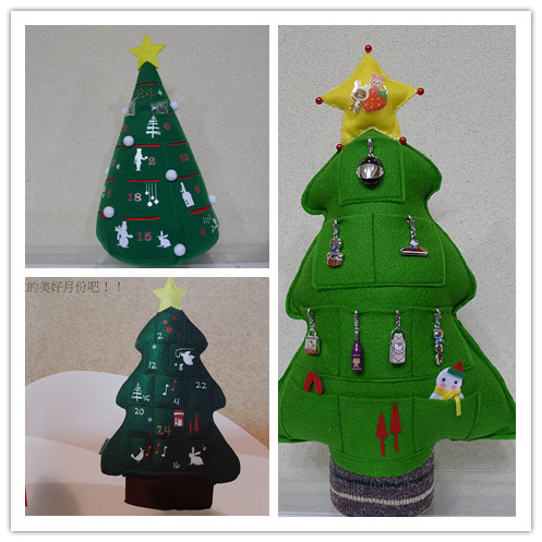 根據手作達人我的仔細研究--這棵聖誕樹應該是用紅色及綠色2片不織布疊在一起,裁剪成圓錐形,然後綠色的不織布先定點剪出洞口位置後,兩片車縫在一起,最後再和一塊綠色圓形不織布,結合成有小口袋的聖誕樹了